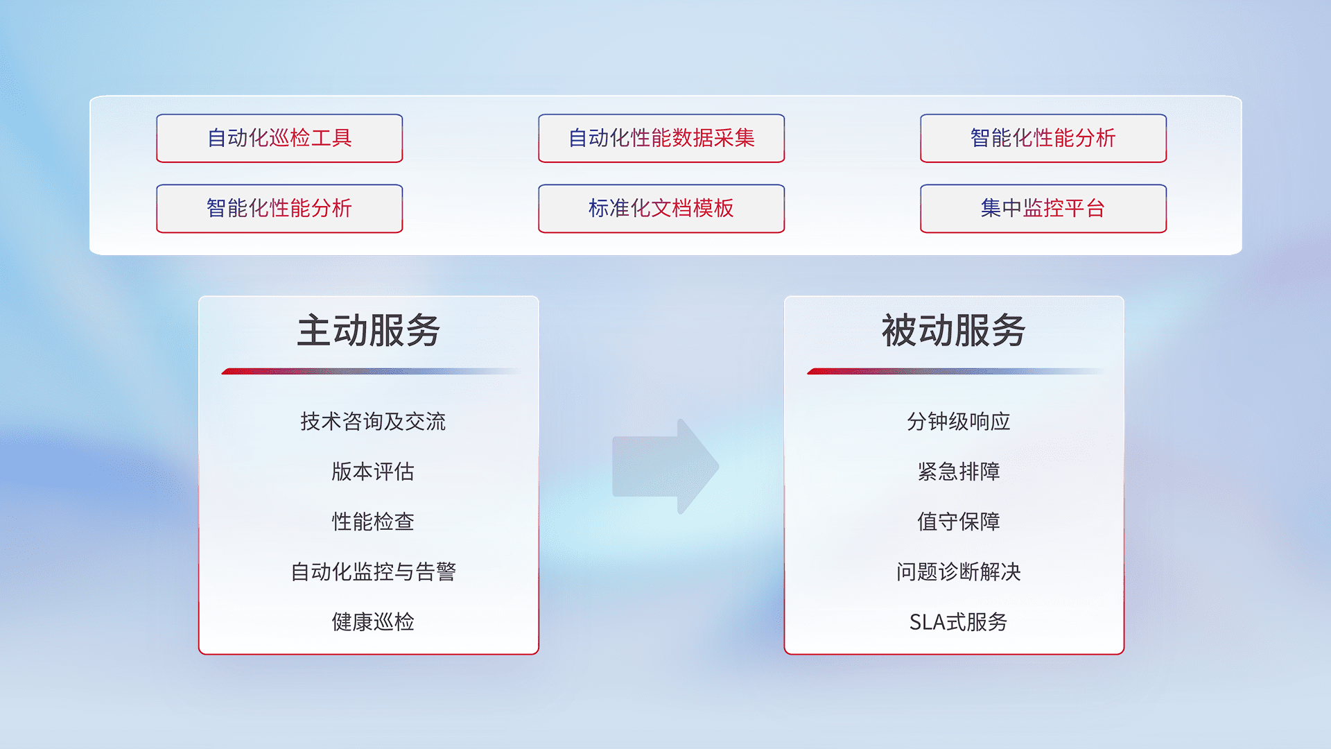 智能化工具和标准化文档,,,保障服务质量,,,,提供主动服务(包含技术咨询、、版本评估、、、性能检查、、、自动化监控与告警、、、、健康巡检)和被动服务包含(分钟级响应、、、、紧急排障、、、值守保障、、、问题诊断解决、、、、SLA服务)。。